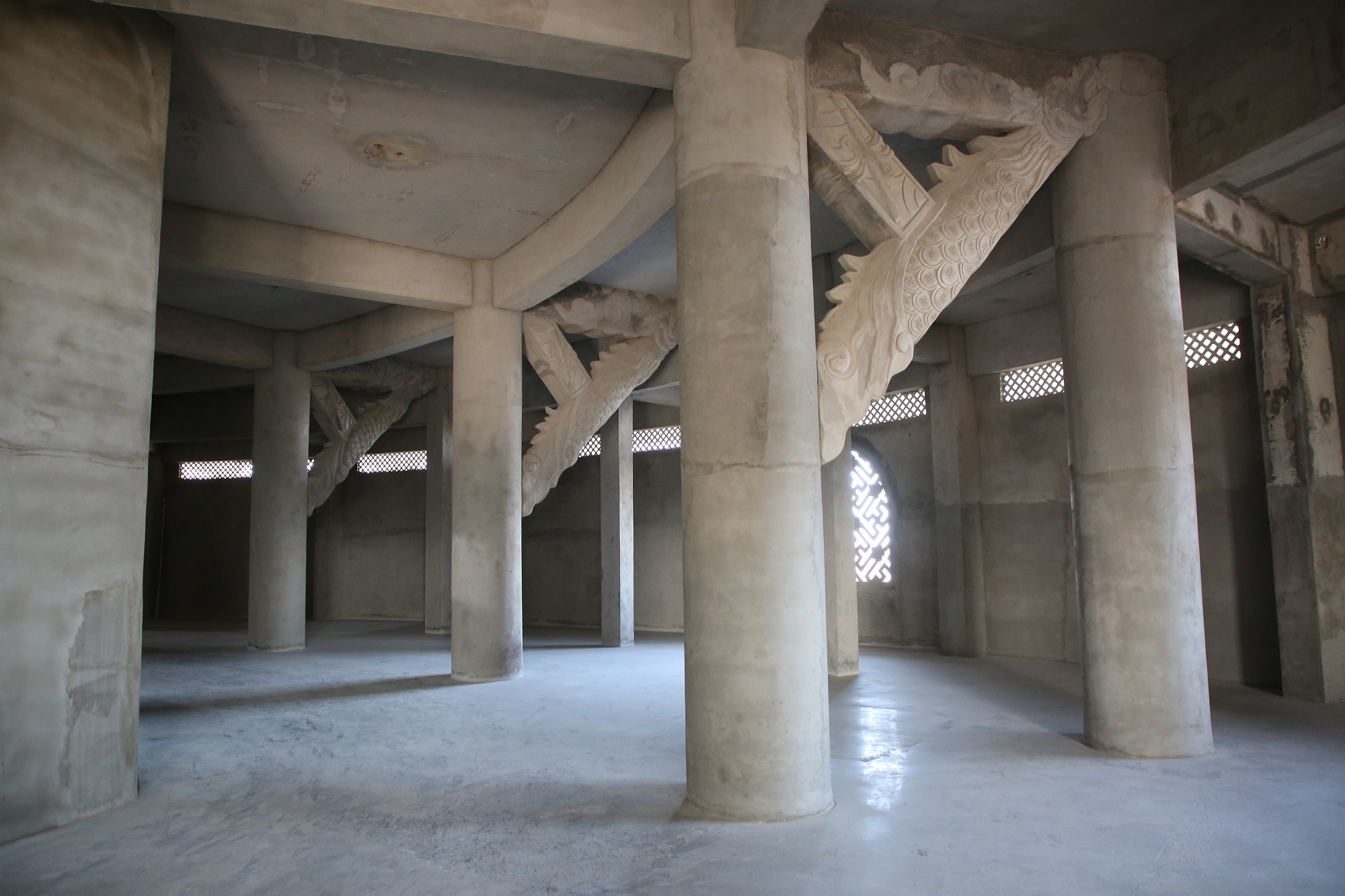Nhiều chi tiết kiến trúc bên trong các tầng tượng được chạm trổ công phu với họa tiết rồng và hoa văn tinh xảo, tạo điểm nhấn nổi bật cho không gian nội thất. |