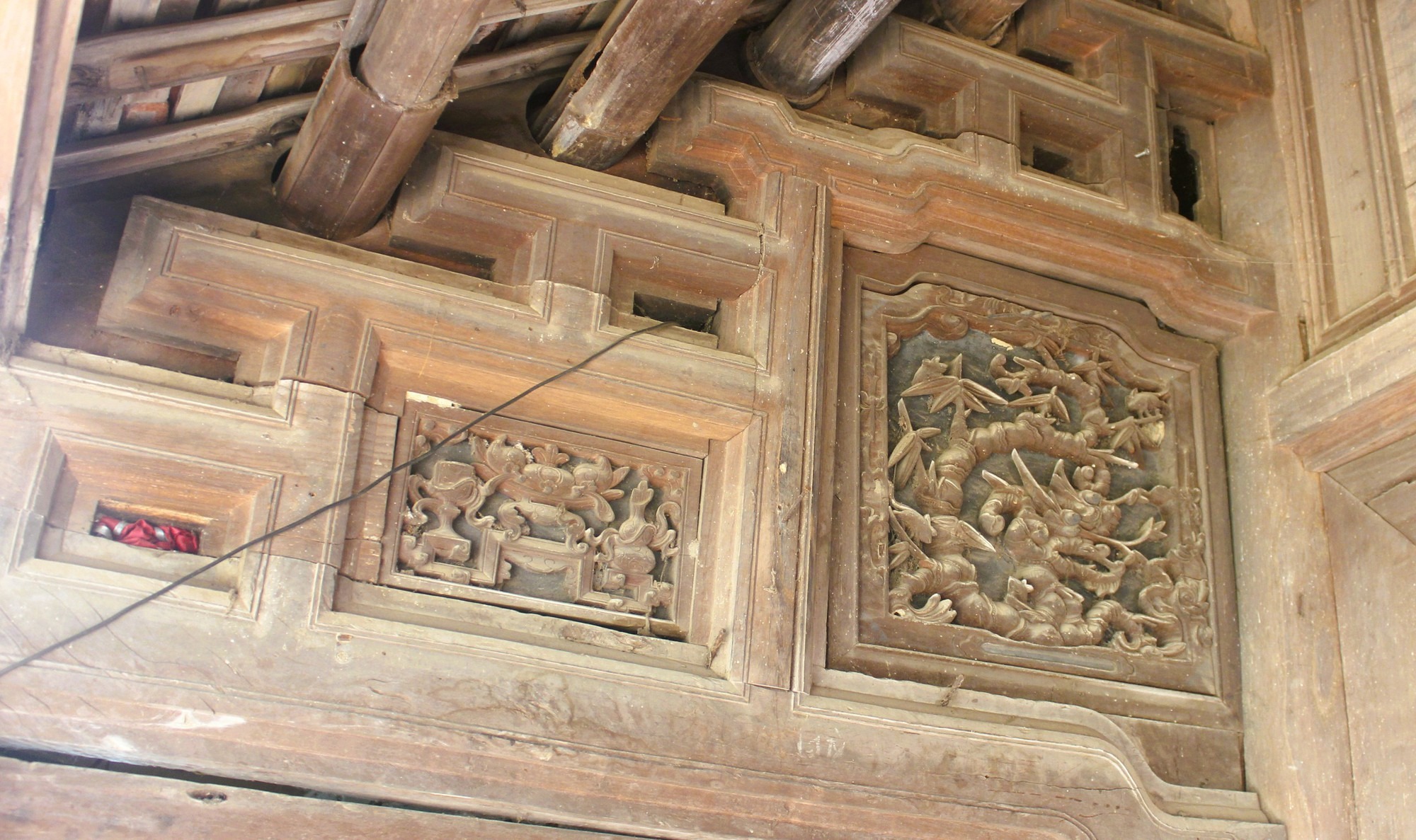Bàn thờ, các vì, kèo, cột gỗ được chạm trổ công phu, mang đậm dấu ấn thời gian |