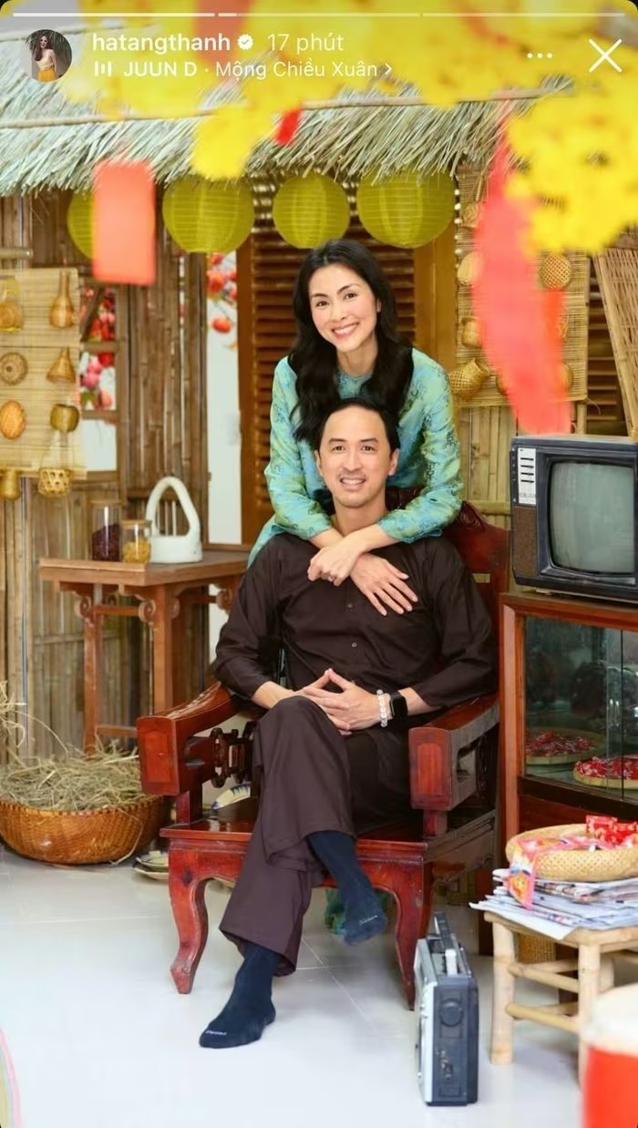 Vợ chồng Tiên Nguyễn hào hứng check-in trong biệt thự ngày Tết. Ảnh: FBNV |