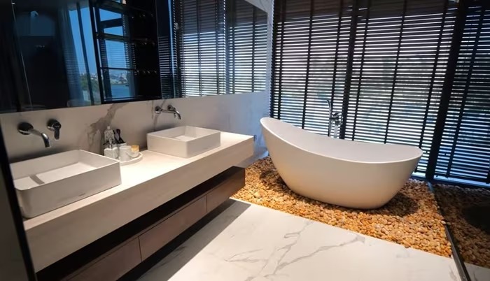 Phòng tắm với đầy đủ nội thất hiện đại. Ảnh chụp màn hình |