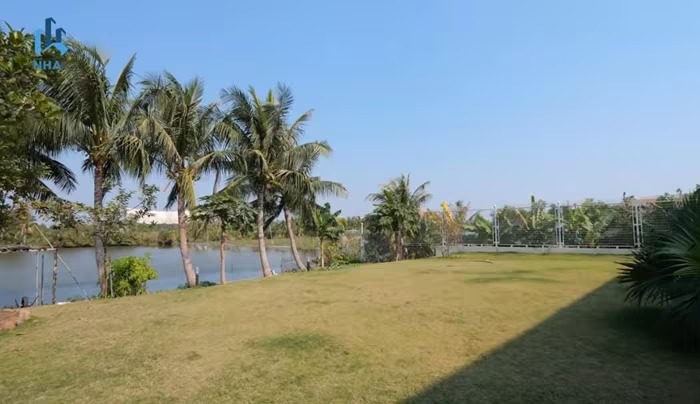 Sân vườn phía sau là thảm cỏ và hàng dừa xanh mướt. Ảnh chụp màn hình |