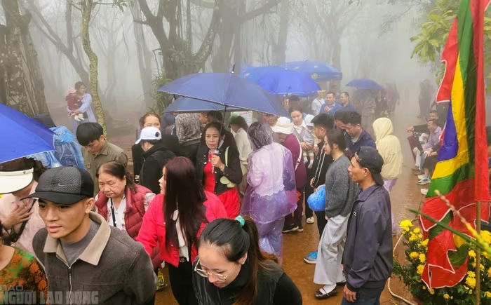 Hình ảnh người dân, du khách đội mưa lên đỉnh huyệt đạo thiêng sáng 25-2: