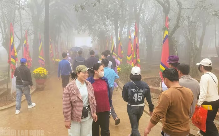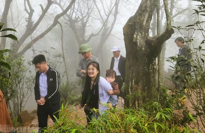 Sáng 25-2, dù thời tiết mưa nặng hạt, sương mù dày đặc nhưng không ngăn được dòng người lên đỉnh ngàn Nưa |