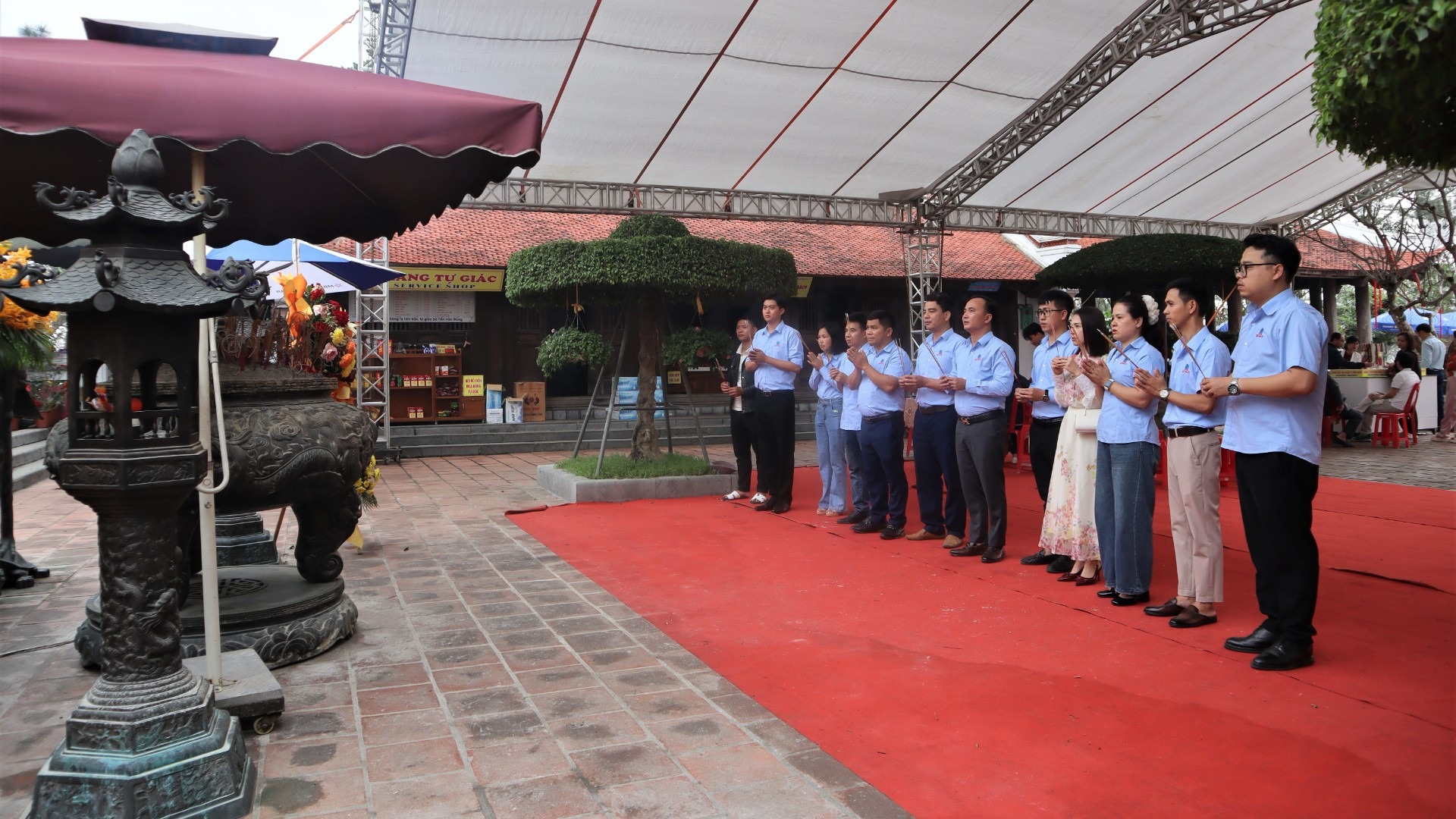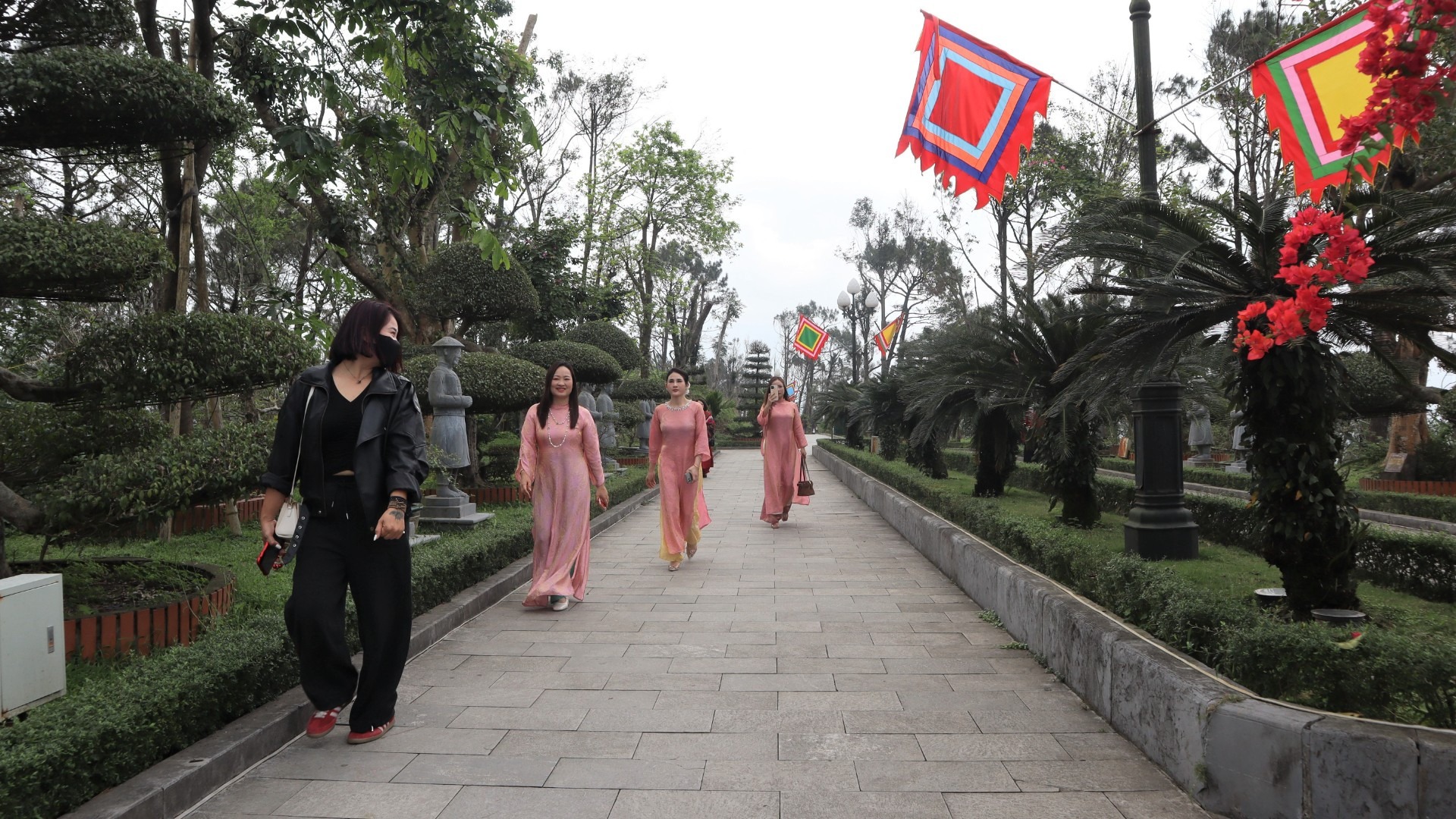 Du khách cùng nhau lưu lại khoảnh khắc đến Đền thờ Hoàng đế Quang Trung chiêm bái, du xuân. |