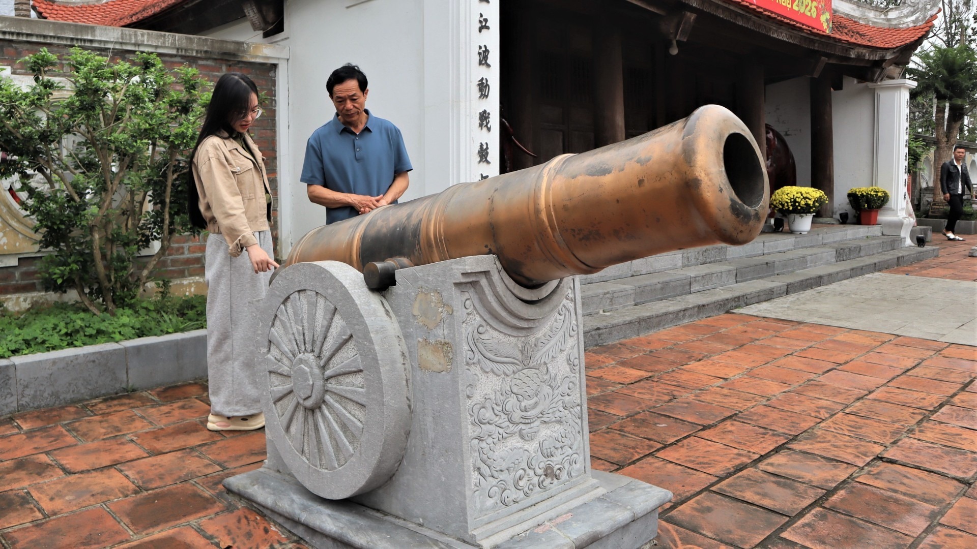 Hai khẩu thần công được đúc bằng đồng đặt trước nghi môn. |