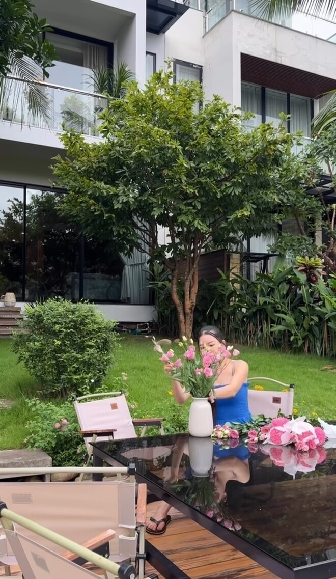Khoảnh khắc Yến Xuân ngồi cắm hoa trong khu vườn xanh mát của biệt thự, cho thấy niềm yêu thích trang trí nhà cửa và cuộc sống gần gũi với thiên nhiên |