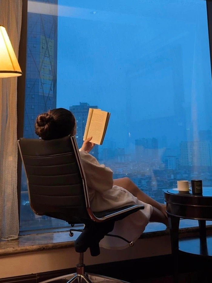 Bà xã của thủ môn Văn Lâm thường đọc sách trong phòng ngủ có cửa kính rộng, view thành phố |