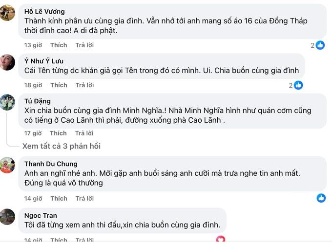Dưới các bài đăng tưởng niệm, nhiều bình luận khiến người đọc nghẹn lòng. Tài khoản Trịnh Quốc Đạt viết: “Lâu lắm mới nghe lại tên anh, không ngờ là trong hoàn cảnh này. Xin chia buồn cùng gia đình, mong anh ra đi thanh thản.” Một cổ động viên khác nhớ về “cặp đôi Trung Vĩnh – Minh Nghĩa” từng làm nên sức sống cho hàng công Đồng Tháp.