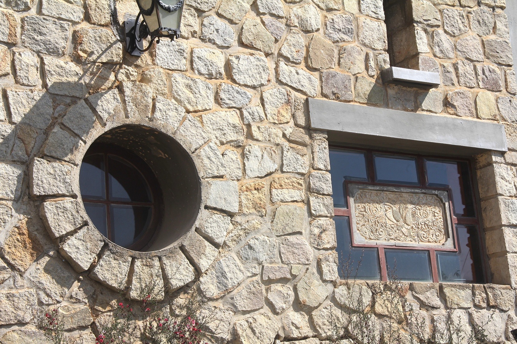 Công trình độc đáo này được thiết kế với nhiều cửa số hình khác nhau, được xây dựng bằng những viên đá lớn. |
