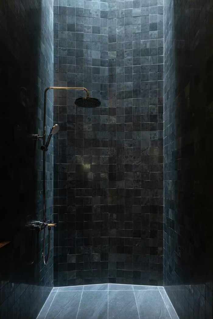 Về vật liệu, đá tự nhiên tông màu tối được sử dụng làm vật liệu hoàn thiện chính, gợi cảm giác vững chắc và bền bỉ. Ảnh: Quang Dam |