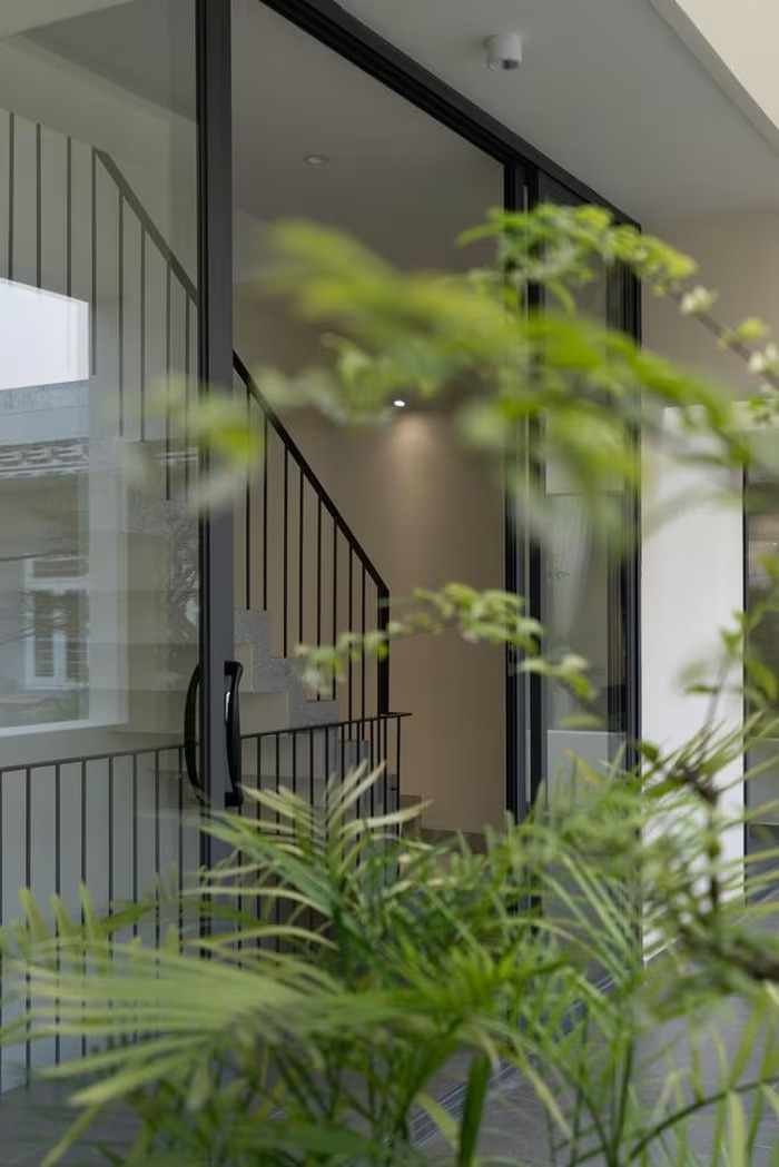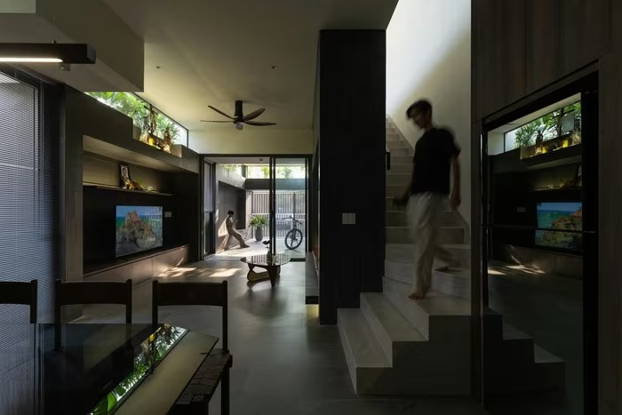 Thay vì lấp đầy diện tích bằng những mảng tường đặc, ngôi nhà chọn “khoảng rỗng” làm hạt nhân, như một nhịp thở len lỏi giữa những khối bê tông san sát. Ảnh: Quang Dam |