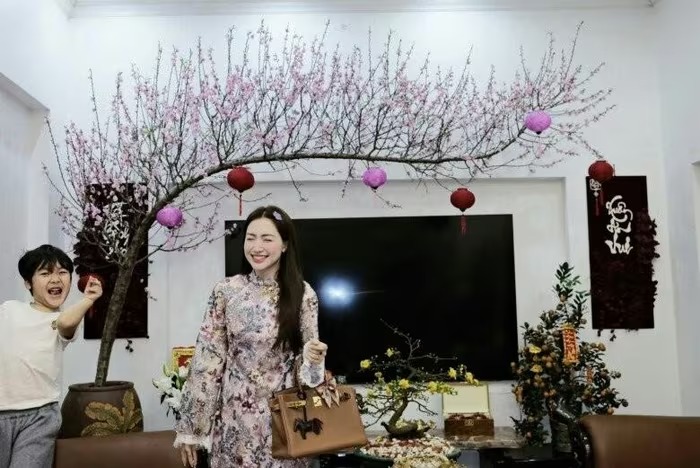 Dịp Tết vừa qua, Hòa Minzy hé lộ một góc nhà trang trí đậm chất truyền thống với cành đào dáng huyền mềm mại, điểm xuyết đèn lồng đỏ rực rỡ. Ảnh: FBNV |