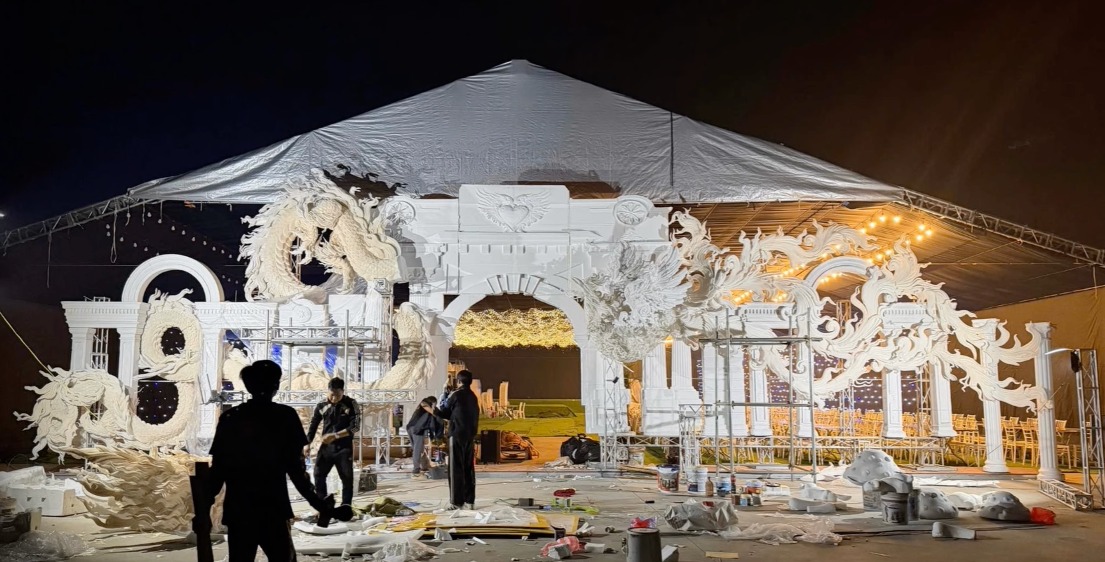 Theo hình ảnh mới nhất được chia sẻ, rạp cưới tại quê nhà chú rể ở Hải Phòng đang được thi công gấp rút với quy mô cực lớn, thiết kế như một sân khấu sự kiện hoành tráng. Toàn bộ cổng chính và khu vực sân khấu được trang trí bằng các chi tiết hoa văn trắng tinh xảo, uốn lượn cầu kỳ, tạo cảm giác sang trọng như bước vào một lễ đường cổ tích. Phần mái rạp cao rộng, hệ thống ánh sáng được lắp đặt chuyên nghiệp như một sân khấu biểu diễn.