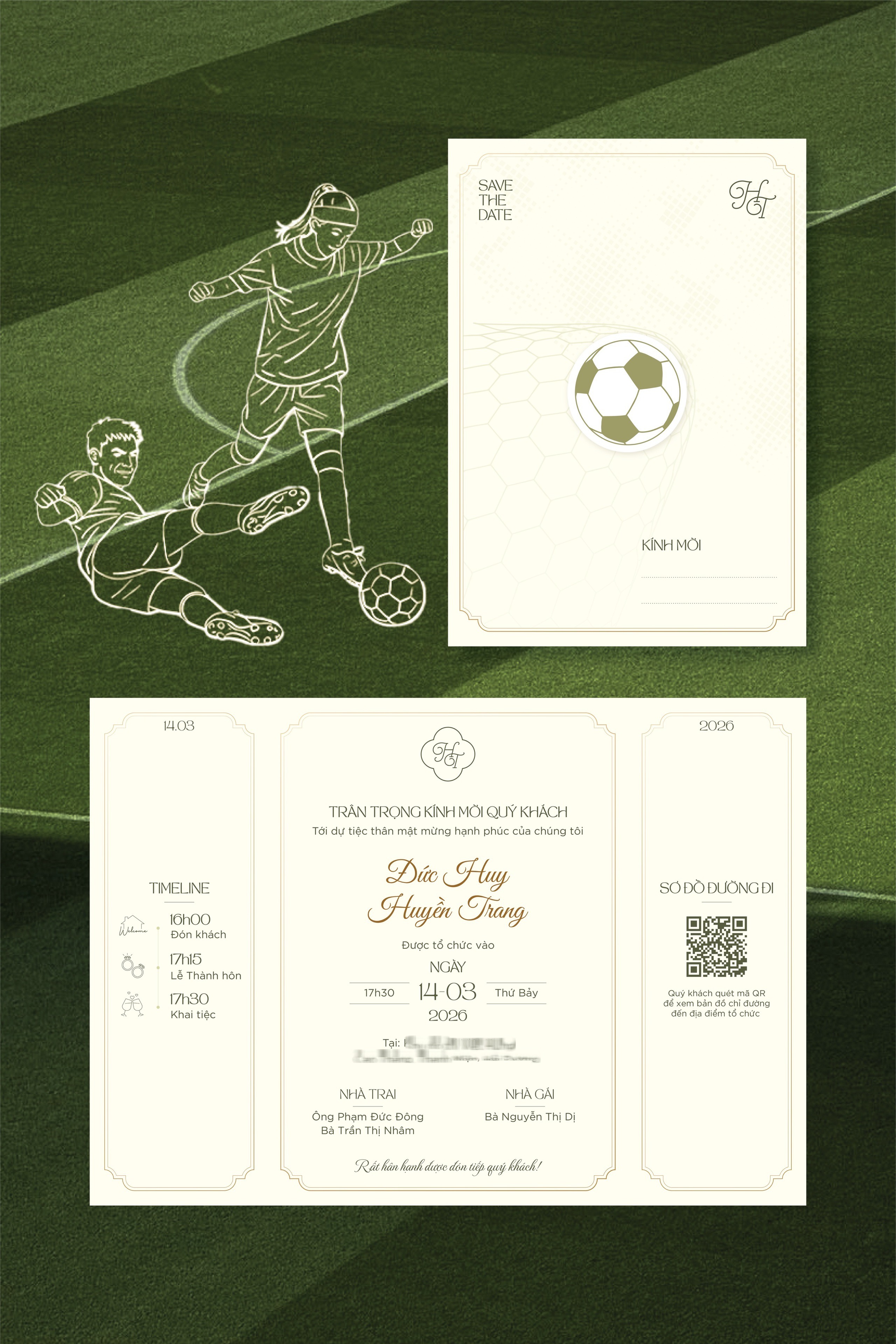 Không chỉ không gian tiệc cưới, thiệp cưới của cặp đôi cũng khiến dân mạng thích thú vì mang đậm dấu ấn bóng đá - nghề nghiệp của chú rể Đức Huy. Thiệp được thiết kế trên nền sân cỏ xanh, kèm hình minh họa hai cầu thủ đang tranh bóng, cùng biểu tượng trái bóng tròn quen thuộc.