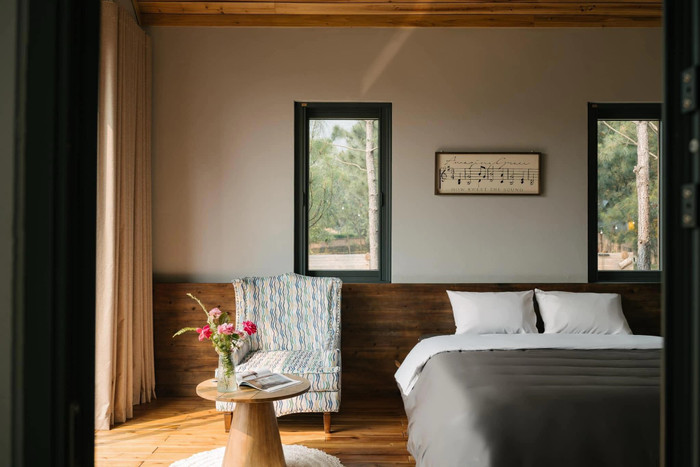 Không gian phòng ngủ cũng được thiết kế ấm cúng, với tầm nhìn ra rừng thông đầy thơ mộng |