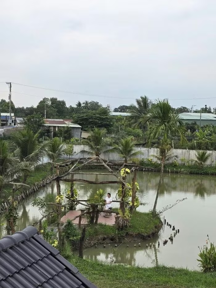 Ao cá rộng hơn 1.000 m2 với nhiều loại cá tự nhiên từ sông bơi vào. Ảnh: FBNV |