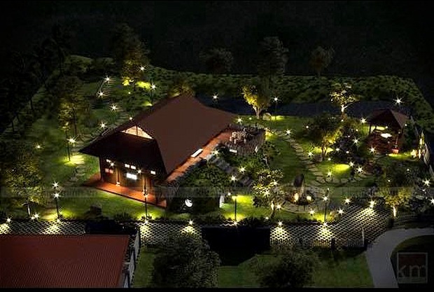 Trong khuôn viên biệt thự được bố trí nhiều khu vực bàn ghế và chòi nghỉ ngoài trời. |