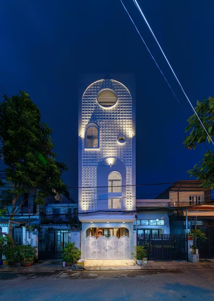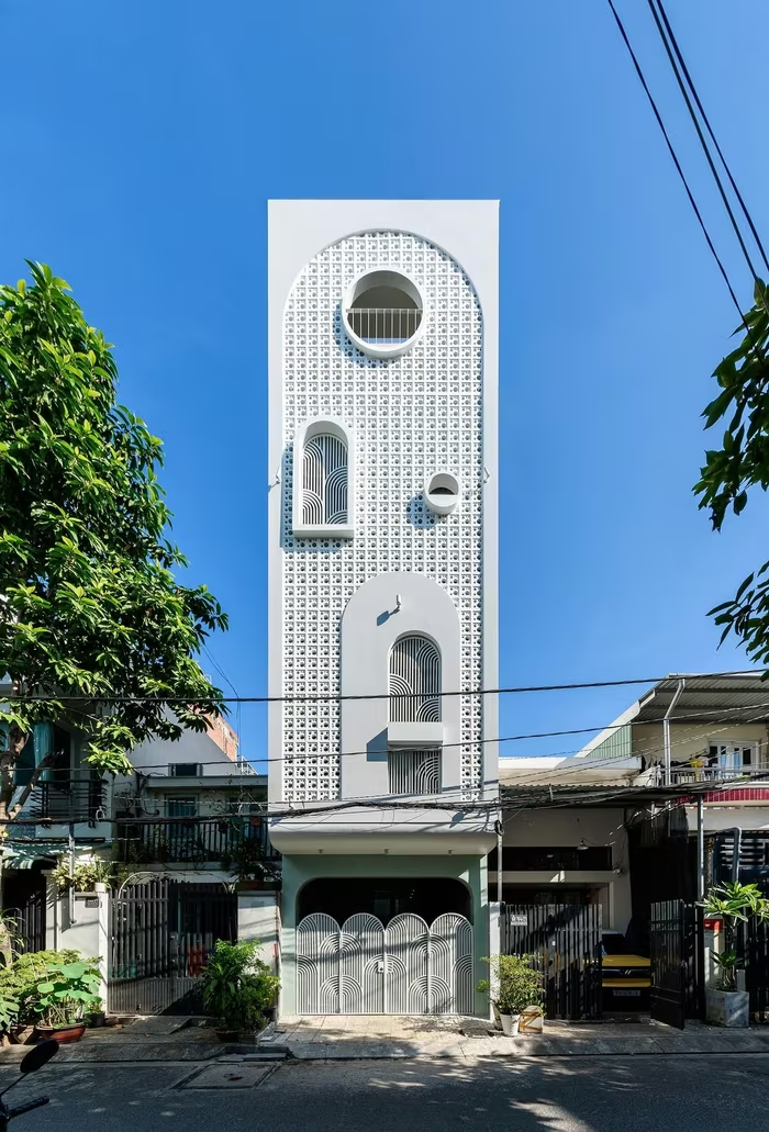 Mặt tiền được bao bọc bởi một lớp gạch bông gió màu trắng, gợi liên tưởng đến chiếc áo blouse của người bác sĩ. Ảnh: LonTon Studio |