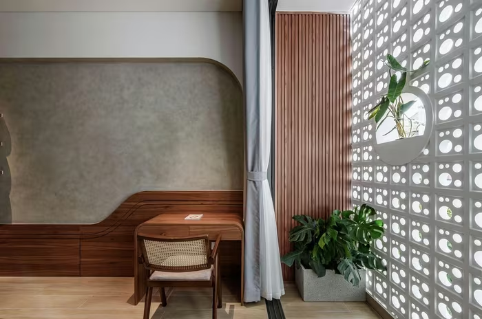 Góc làm việc đặt sát ban công, tận dụng ánh sáng tự nhiên lọc qua lớp gạch bông gió. Ảnh: LonTon Studio |