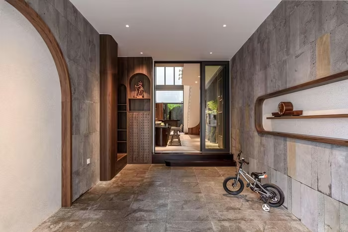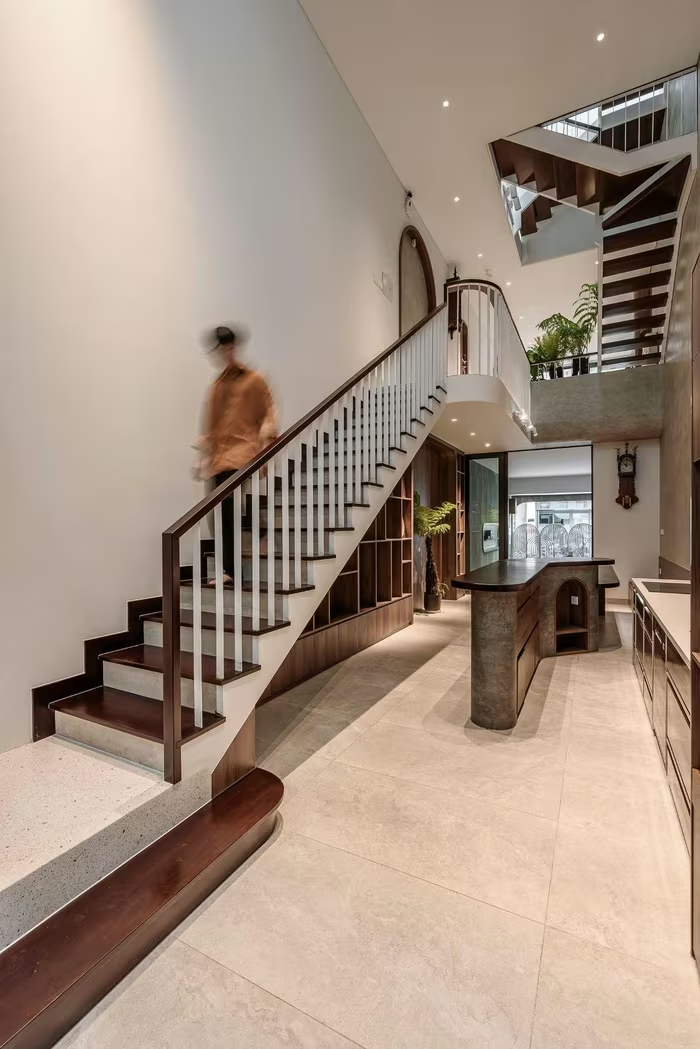 Với bề ngang chỉ 3,8m và cần bố trí chỗ để ô tô 7 chỗ, cùng ba phòng ngủ, phòng khách, bếp, phòng ăn, bài toán đặt ra không nằm ở việc “lấp đầy”, mà là cách tạo ra khoảng trống hợp lý. Ảnh: LonTon Studio |