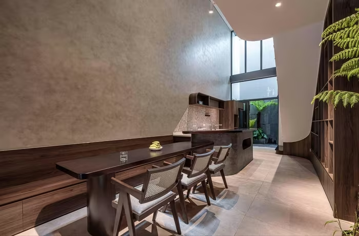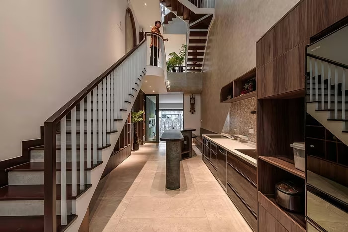 Bếp và bàn ăn được bố trí dọc nhà, sử dụng chất liệu gỗ tông trầm, kết hợp ánh sáng từ thông tầng phía sau tạo cảm giác ấm áp. Ảnh: LonTon Studio |