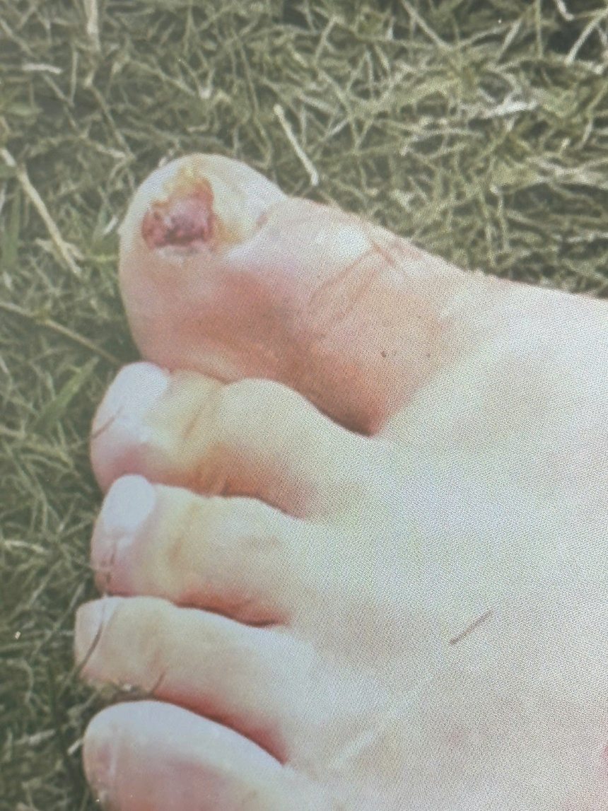 Cận cảnh móng chân của Xuân Mạnh bị bật. |