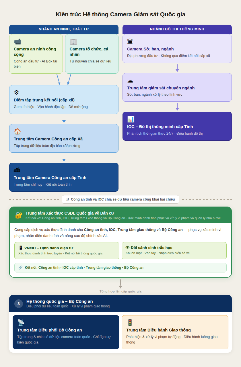 Hệ thống camera giám sát các cấp không kết nối trực tiếp với Cơ sở dữ liệu quốc gia về dân cư. Mọi truy vấn để xác thực điện tử phải thực hiện qua Trung tâm xác thực của Bộ Công an bằng giao diện lập trình ứng dụng (API) bảo mật (https, VPN, ký số), có mã định danh và ghi nhật ký từng lần truy cập.