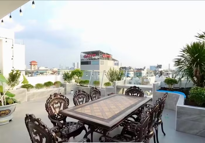 Khuôn viên sân thượng thoáng đãng là nơi vợ chồng nghệ sĩ thường lên ngắm cảnh, suy nghĩ kịch bản. Tiến Luật đặt một bộ bàn ăn ngoài trời, cho trồng các loại cây cảnh để thêm mảng xanh vào không gian sống |