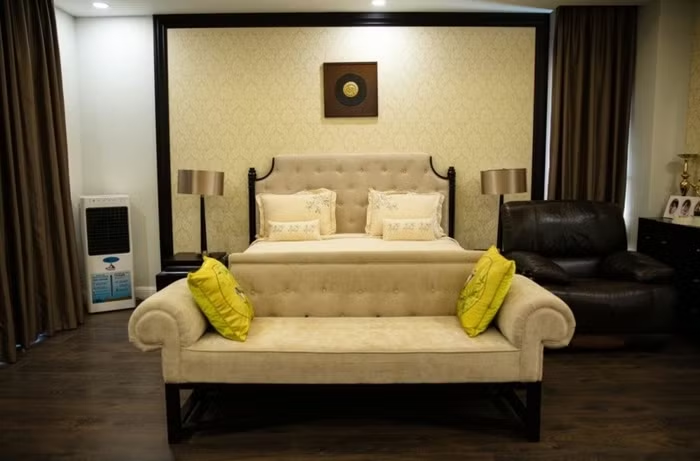 Hơn thế nữa, phòng ngủ có nội thất đơn giản với giường cỡ lớn, phong cách thiết kế với cảm hứng từ hoàng gia. Giấy dán tường ở phần đầu giường cũng đưa lại "vibe" quý tộc với tông màu vàng nhẹ cùng họa tiết cầu kỳ lạ mắt |