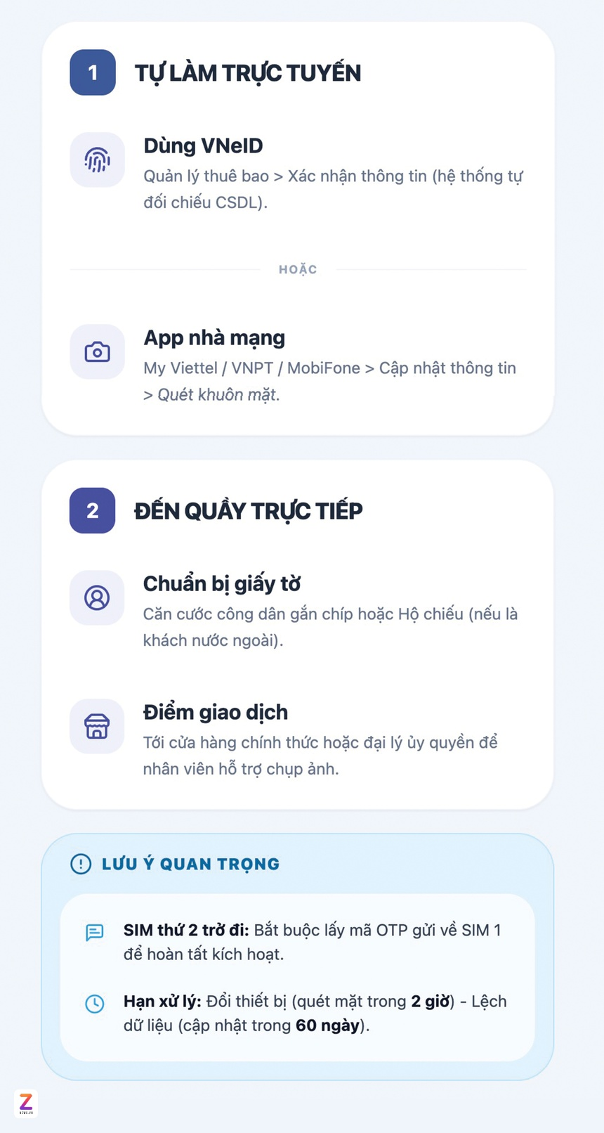Khách hàng sở hữu nhiều số di động sẽ phải nhập mã OTP gửi về thuê bao đầu tiên được xác minh. Với khách hàng nước người nước ngoài, được cấp định danh điện tử tại Việt Nam, có thể thao tác trực tuyến trên VNeID. Nếu không, đối tượng này dùng hộ chiếu nhằm xác minh trực tiếp ở các cửa hàng nhà mạng.