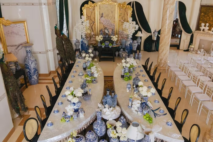 Không gian gây ấn tượng bởi sự kết hợp giữa các chất liệu như khảm vàng miếng và gốm sứ, những yếu tố mang tính thẩm mỹ cao và gợi cảm giác sang trọng. Theo nhà thiết kế Lâm Lâm, đây không đơn thuần là vật trang trí mà còn góp phần tạo chiều sâu, nâng tầm tổng thể không gian. |