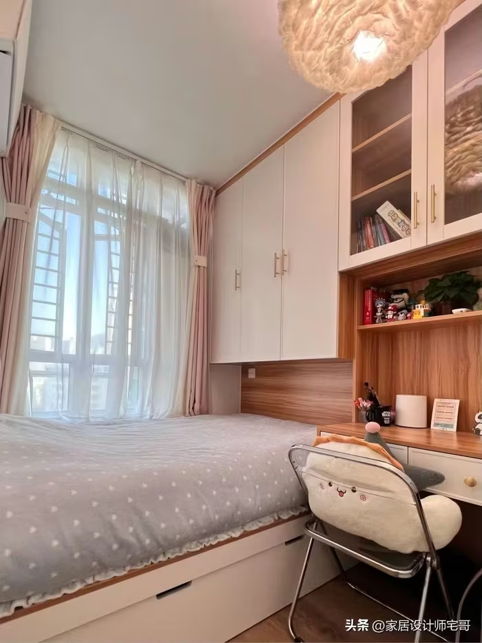 Bàn gấp nhỏ bố trí cạnh tủ, có thể dùng làm bàn làm việc hoặc bàn trang điểm. Ảnh: Tóutíao |