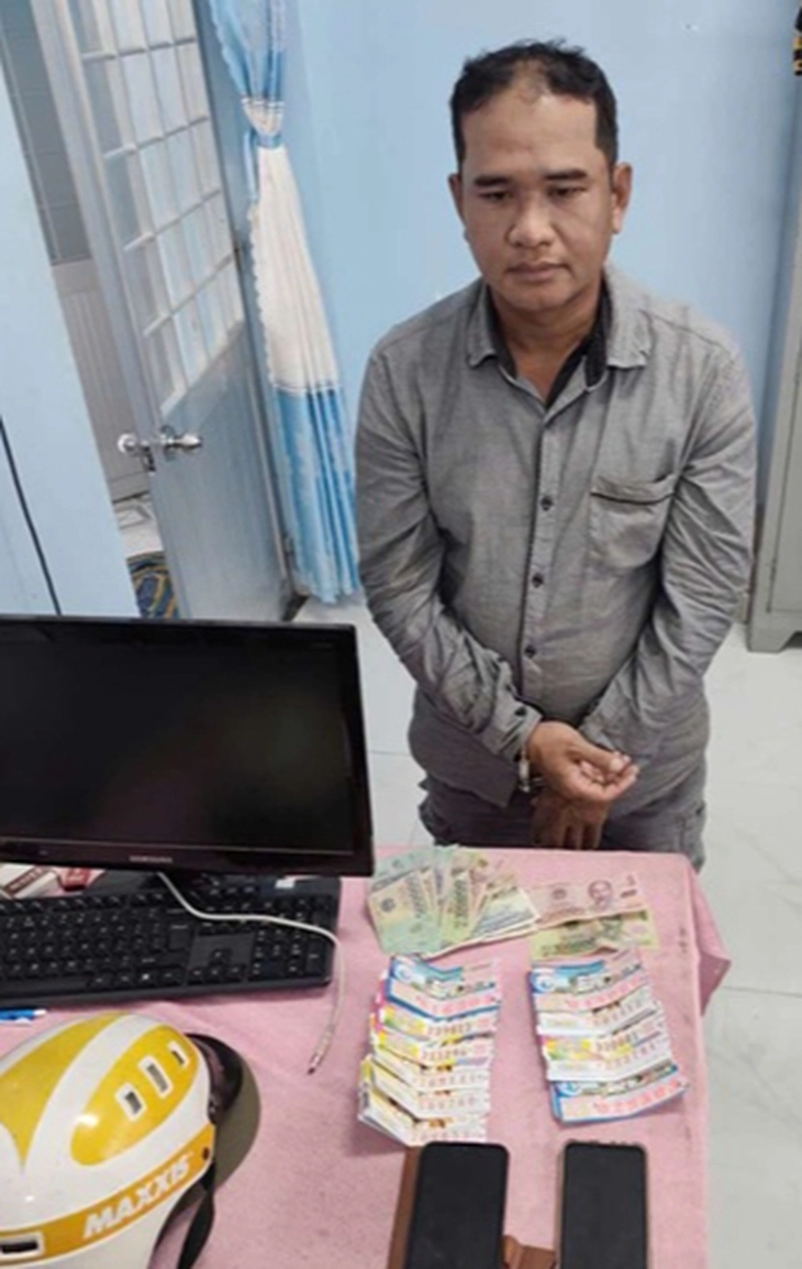 Phạm Hồng Toàn (40 tuổi, ngụ xã Lộc Thuận, tỉnh Vĩnh Long) cùng số vé số cướp giật được tại cơ quan công an - Ảnh: Công an Đồng Tháp |