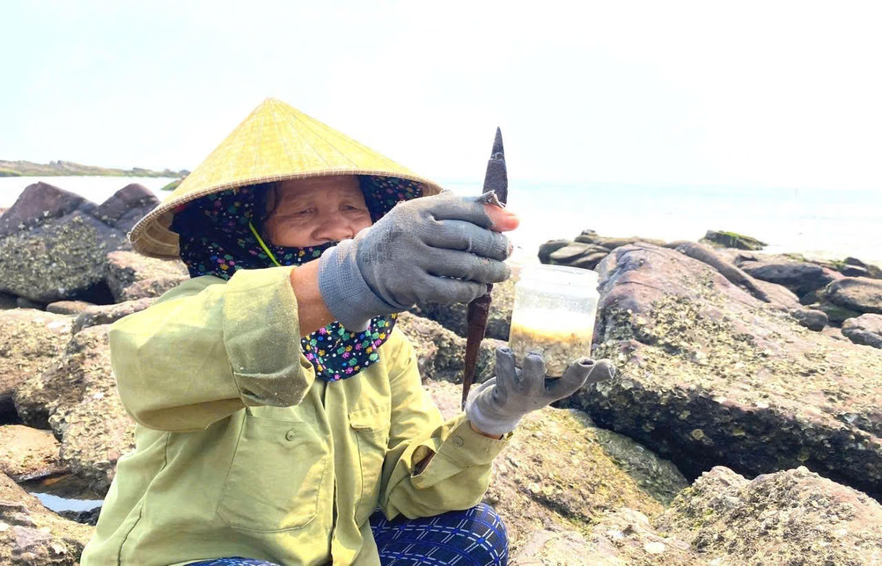 Dưới cái nắng như đổ lửa, trên những mỏm đá trơn trượt, sắc nhọn, công việc của họ bắt đầu bằng những động tác quen thuộc: cúi người, tìm kiếm cụm hàu nhỏ bám chặt vào đá. Dụng cụ lao động chỉ là những thanh sắt thô sơ do chính họ tự chế. Một đầu được mài nhọn để cạy hàu, đầu còn lại dẹt để tách phần ruột. Nhìn qua thì đơn giản, nhưng để lấy được những con hàu nhỏ bé nằm sâu trong lớp vỏ cứng và bám chặt vào kẽ đá lại đòi hỏi sự khéo léo, kiên nhẫn và kinh nghiệm tích lũy qua nhiều năm.