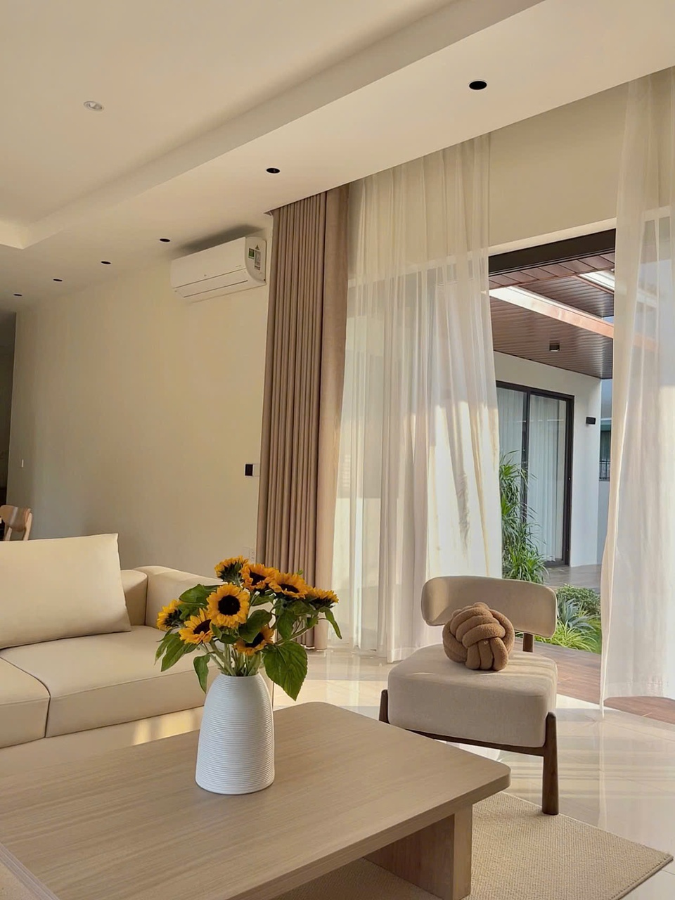 Ngôi nhà 1 tầng của vợ chồng anh Nam rộng 170 m2, được xây dựng theo phong cách Japandi (kết hợp sự tối giản của Nhật và ấm áp Bắc Âu) với gam màu kem và gỗ chủ đạo. Tinh thần này còn thể hiện ở cách gia chủ tối giản đồ đạc, khéo léo “giấu” mọi vật dụng vào hệ tủ để giữ không gian luôn gọn gàng.