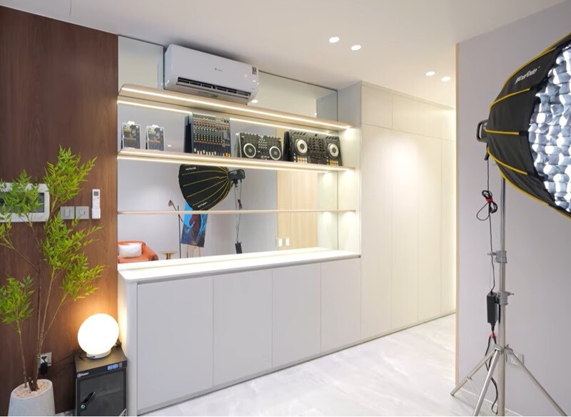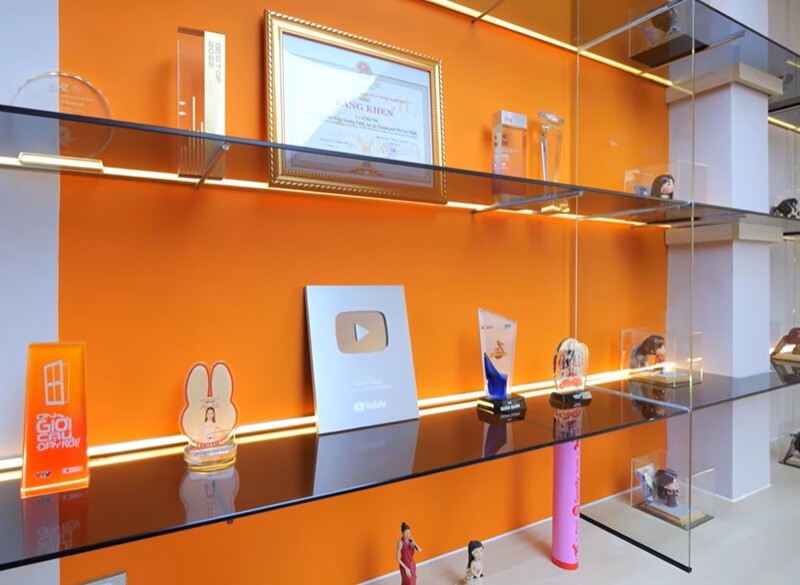 Những chiếc kệ kính chạy dài là nơi lưu giữ "gia tài" âm nhạc đồ sộ với hàng loạt giải thưởng danh giá, Nút bạc YouTube và những album kỷ niệm chặng đường 10 năm ca hát đầy thăng trầm. |