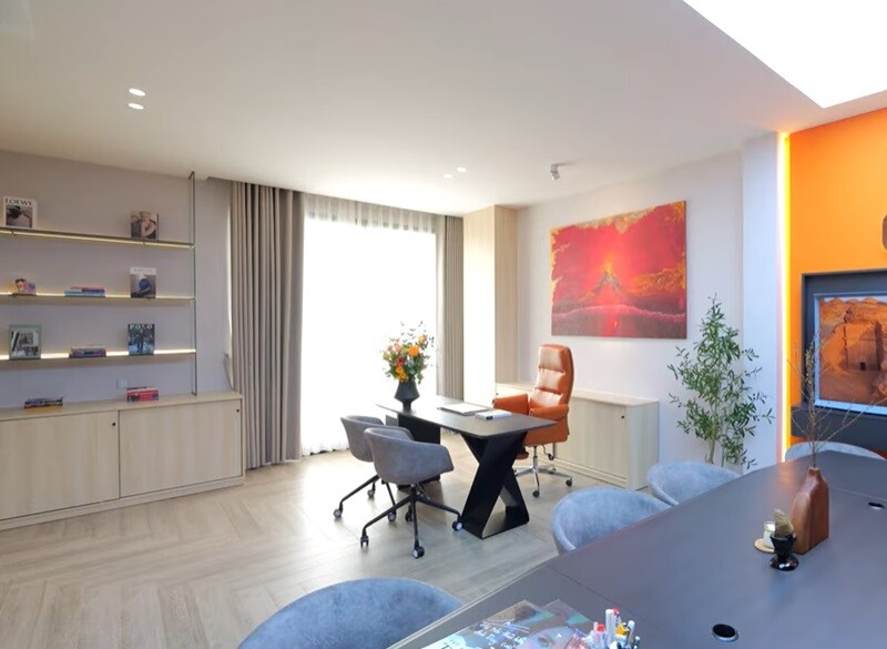 Đây là nơi Hà Nhi đặt văn phòng làm việc với những mảng tường cam rực rỡ - gam màu mà cô tin rằng sẽ kích thích tối đa sự sáng tạo. |