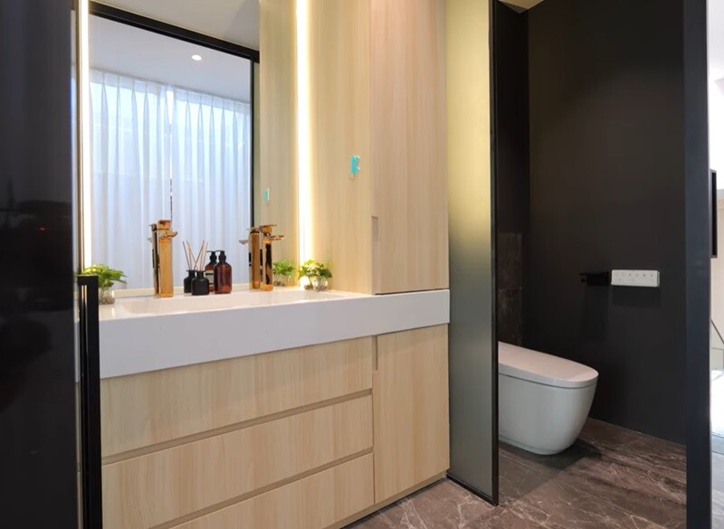 Nhà vệ sinh, phòng tắm cũng là nơi Hà Nhi cực kỳ chú trọng. Phòng vệ sinh ngay sát phòng ngủ được nữ ca sĩ lý giải là do... lười, chỉ một thời gian rất ngắn để cô có thể tiếp cận khu vực này. |