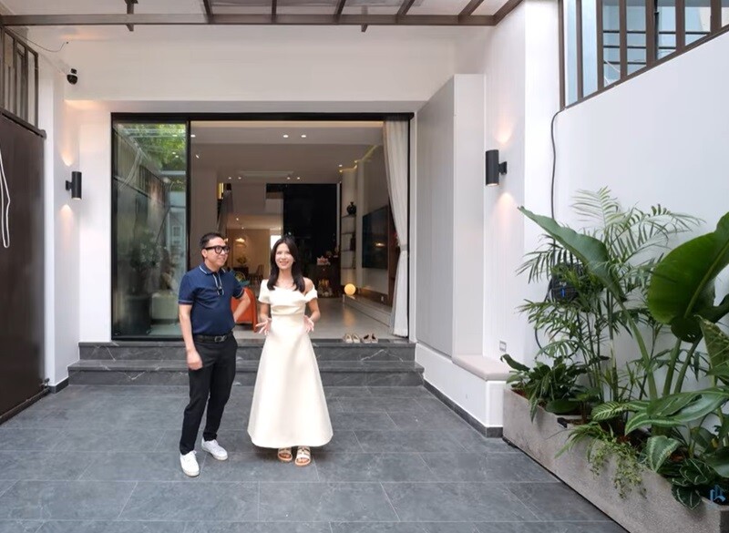 Căn nhà phố hiện đại, ấm cúng với diện tích 120m2. Cô chia sẻ trong chương trình Nhà F: "Lúc mà em mua căn này em đâu có quan tâm gì đến diện tích đâu. Em thích là em mua à..." Cơ ngơi có khoảng sân vườn phía trước, mái che có thể mở ra khi muốn tắm nắng. |