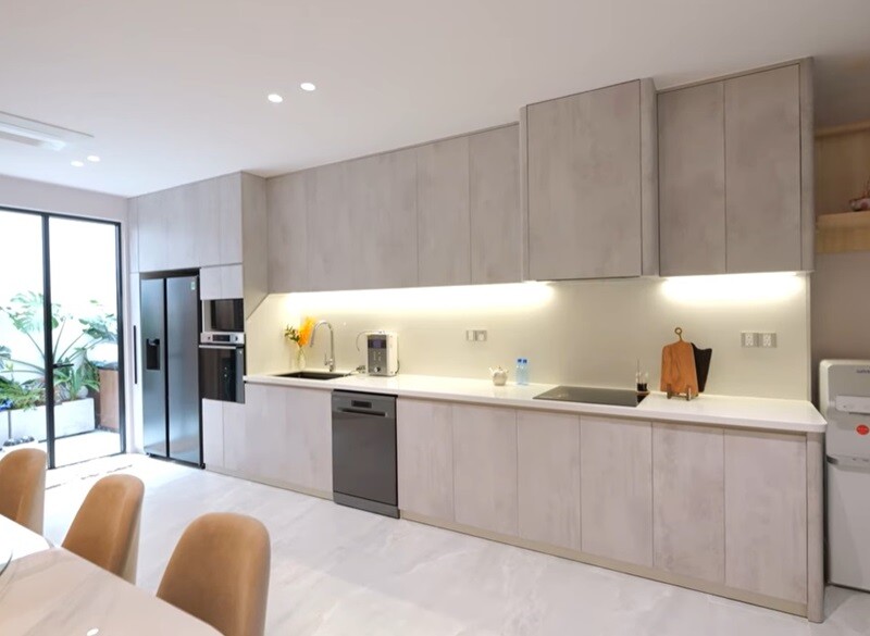 Phòng khách trưng bày bức tranh trừu tượng lớn và nhiều hoa tươi. Đặc biệt, Hà Nhi còn trang trí những "bông hoa tài lộc" với hy vọng mang lại may mắn. Phòng bếp thiết kế tối giản, sạch sẽ. |