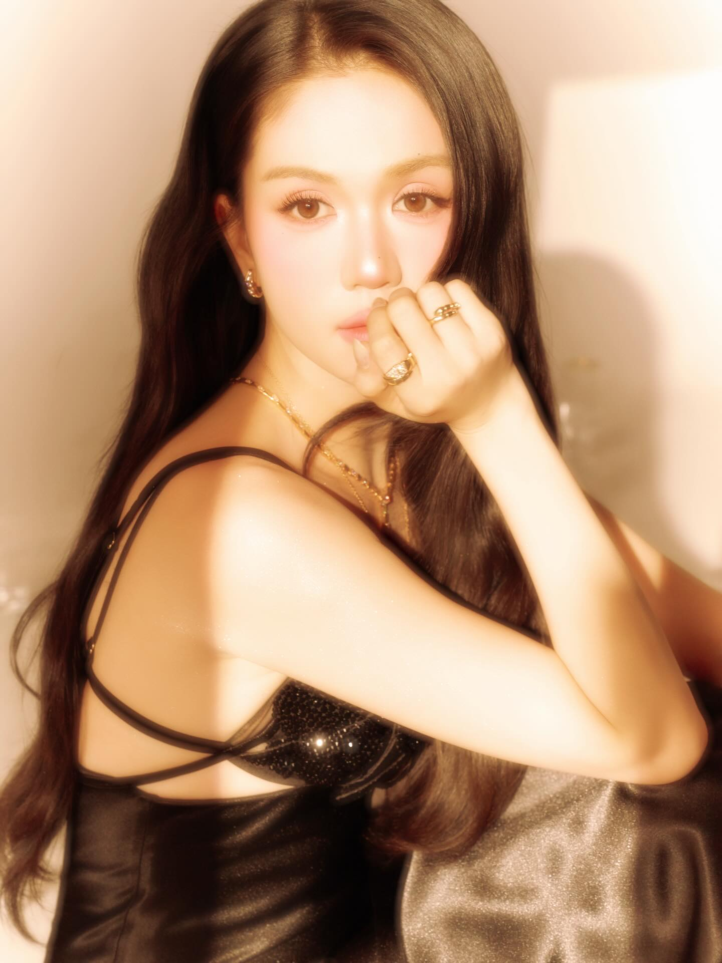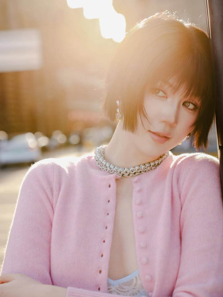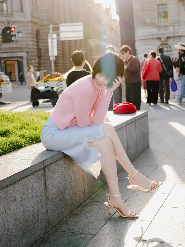 Điểm nhấn khiến anh em phải chú ý chính là chiếc áo khoác mỏng màu hồng khoác hờ trên vai, tạo nên một tổng thể vừa ngọt ngào như "kẹo bông", vừa gợi cảm một cách đầy nghệ thuật. Phụ kiện vòng cổ bản lớn cùng đôi giày cao gót thanh mảnh càng làm nổi bật phần xương quai xanh và đôi chân dài miên man của cô nàng.