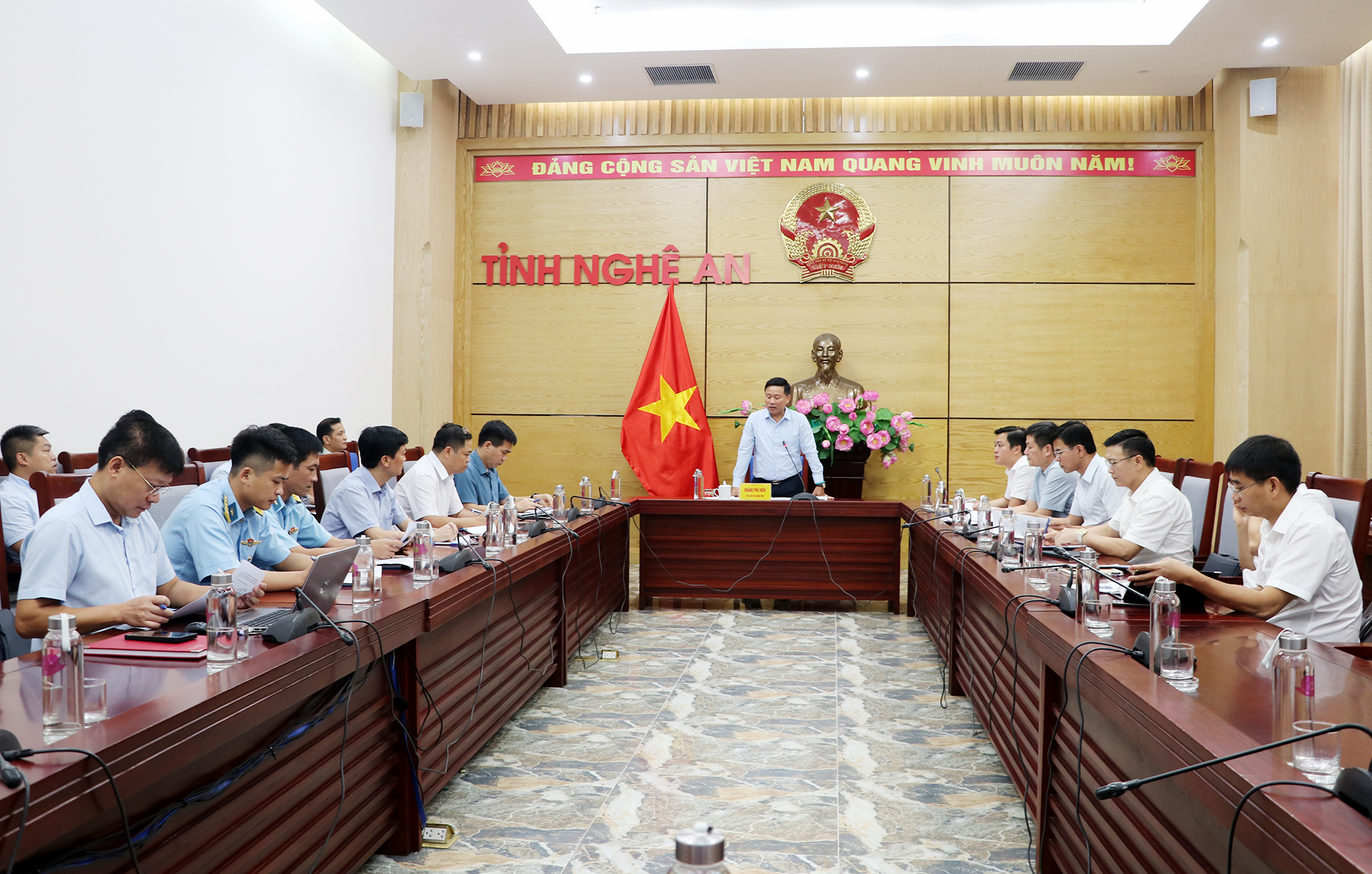 Phó Chủ tịch UBND tỉnh Hoàng Phú Hiền chủ trì cuộc làm việc đôn đốc tiến độ thực hiện dự án kéo dài đường cất hạ cánh tại Cảng hàng không Quốc tế Vinh vào ngày 16/4/2026 |