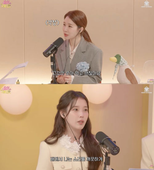 Ngôi sao sinh năm 1993 mỉm cười và nói: "Hôm nay, trước khi đến đây, em đã ăn một quả táo và một quả việt quất”. Yoo In Na cười nói thêm: "Ăn một chút như vậy có sao không?". IU đáp lại "Đó là lý do tại sao bụng em có thể đang kêu. Nhưng đạo diễn âm thanh Yoo In của chúng ta rất tuyệt vời, là một người mà em luôn tin tưởng tuyệt đối. Em tin rằng chị sẽ loại bỏ tiếng bụng kêu một cách hoàn hảo”, khiến mọi người bật cười.