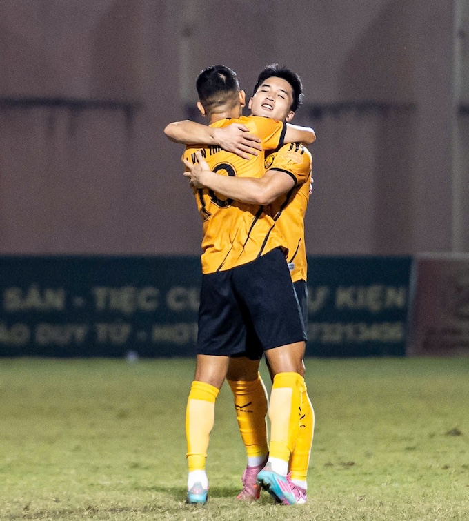 Niềm vui của Ngọc Mỹ và Văn Thắng khi có bàn thắng vào lưới đối thủ. Ảnh: Đức Cường |