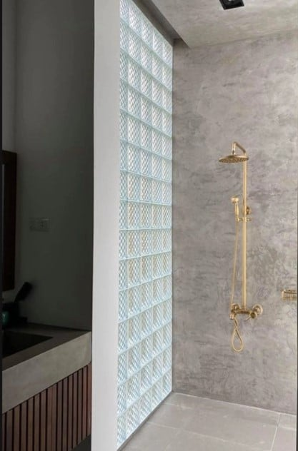 Phòng tắm mang phong cách hiện đại với tông xám xi măng, nổi bật bởi hệ vòi sen ánh kim trên nền tường bê tông giả đá. Một bên sử dụng gạch kính cao sát trần để đón sáng, giúp không gian luôn sáng sủa. Dù dùng kính trong suốt, thiết kế vẫn đảm bảo sự riêng tư.