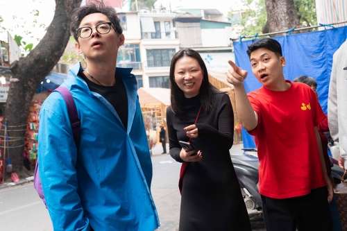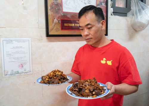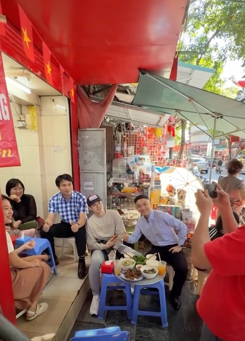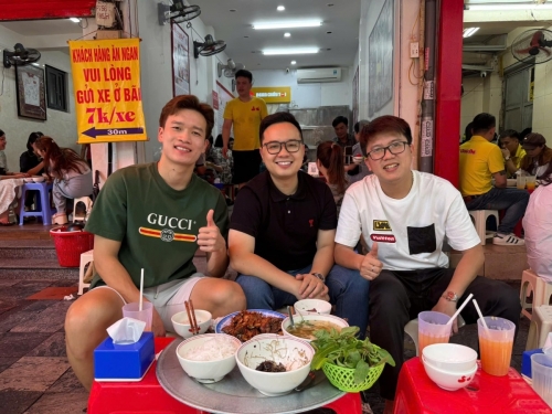 Anh Tú Phạm (bên phải), cháu bà Thủy, hiện phụ giúp quản lý quán, cho biết các cầu thủ bóng đá mách nhau và tự tìm đến ăn. Do lịch thi đấu dày đặc, di chuyển nhiều nên tranh thủ có thời gian rảnh ở Hà Nội, các nhóm cầu thủ đều ghé quán. Theo anh Tú, cầu thủ thường đến bất chợt. Nhiều khách hay hỏi bao giờ cầu thủ đến để gặp chụp ảnh và xin chữ ký nhưng quán hầu như không biết, chỉ thi thoảng mới được báo trước. Anh cho biết rất vui khi quán nhà mình thành điểm hẹn của giới cầu thủ. Trên ảnh, anh Tú ngồi cùng Hoàng Đức (bên trái). |