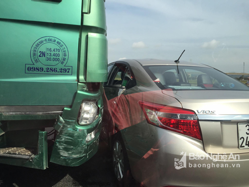 Vào thời gian trên, chiếc xe ô tô màu trắng BKS 37A 24953 đang lưu thông theo hướng Vinh – Hà Nội, đến đoạn trước phòng khám Minh An bất ngờ cua sang trái đã bị xe tải BKS 77C 03893 lưu thông cùng chiều từ phía sau đâm ngang, kéo lê một đoạn khiến xe 4 chỗ hư hỏng nặng, lái xe may mắn thoát chết.