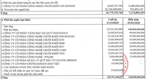 Cụ thể, HVA ghi nhận khoản phải thu với Công ty cổ phần Công nghệ Chuỗi khối ONUSCHAIN gần 30 tỷ đồng, trong đó bao gồm phải thu 4,7 tỷ đồng và hơn 25 tỷ đồng thuộc các khoản phải thu khác. Ngoài ra, doanh nghiệp cũng có khoản phải thu ngắn hạn khác với HanaGold lên tới 35 tỷ đồng.
