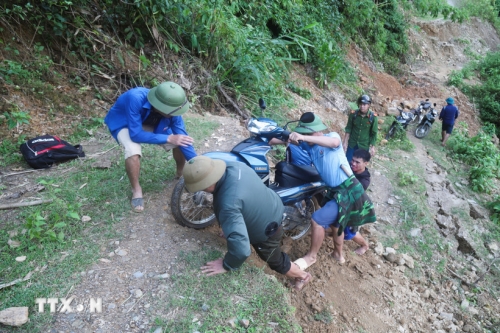 Lực lượng chức năng trong hành trình vượt qua các điểm mặt đường bị đứt gãy, sụt trượt xuống sâu hơn 2m để đến bản Na Ngân bị cô lập. (Ảnh: Xuân Tiến/TTXVN) |