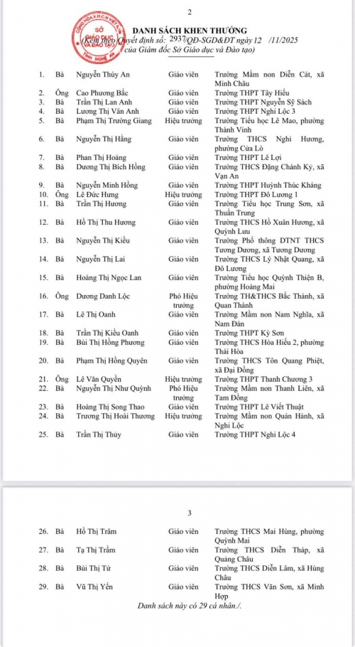 Danh sách 29 nhà giáo tỉnh Nghệ An nhận Quỹ phát triển tài năng giáo dục lần thứ năm 2025. |